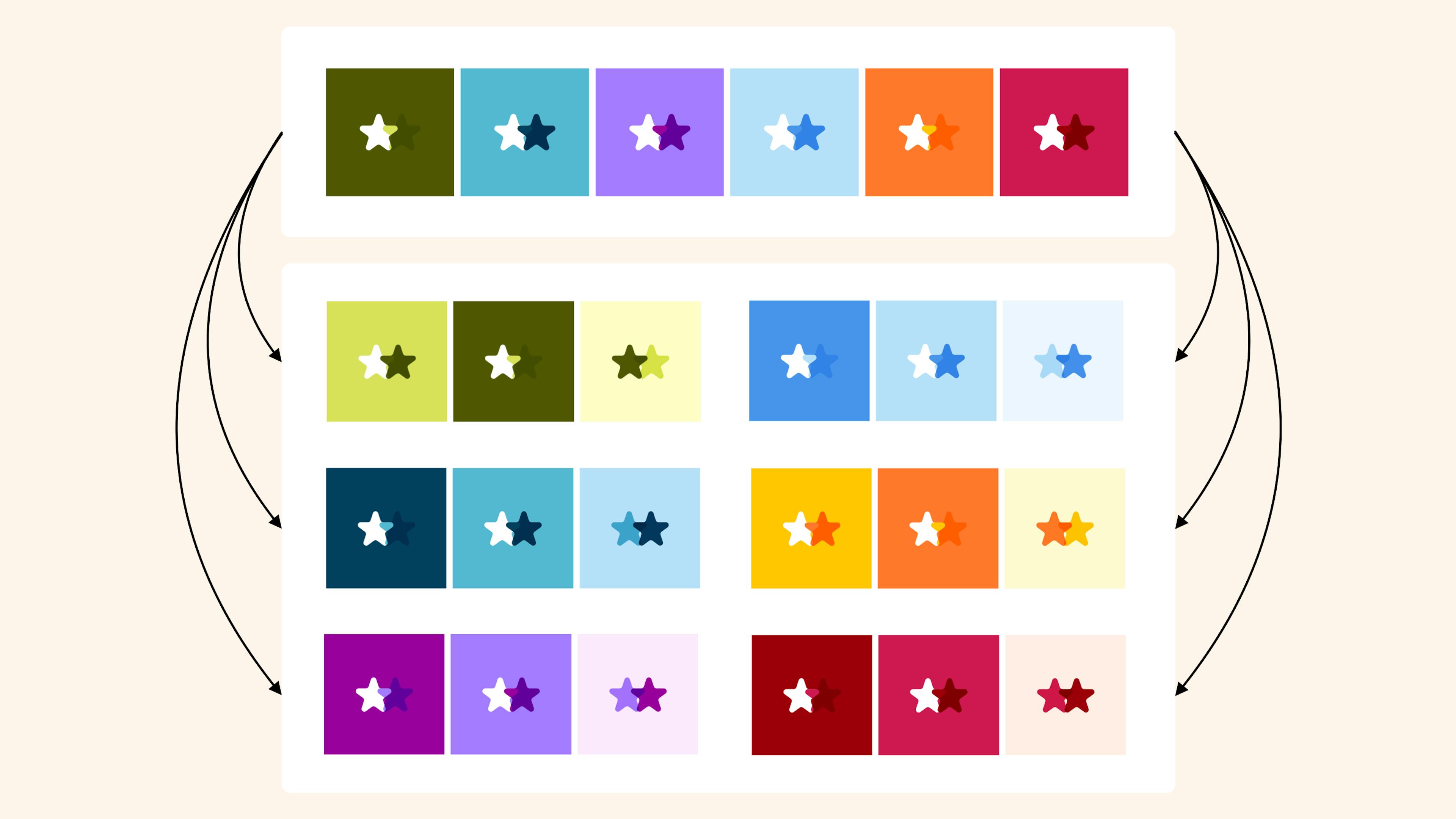 Each colour set has three colours. Changing how those colours are applied to the shapes gives 18 different palettes.